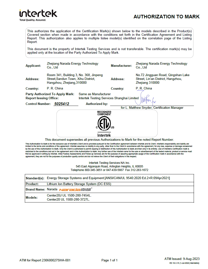 Narada Power is one of the first enterprises that passed UL9540 and UL9540A certification of MW-class containerized energy storage system. Passing UL9540 and UL9540A certifications means Narada’s energy storage system is well accepted around the world.